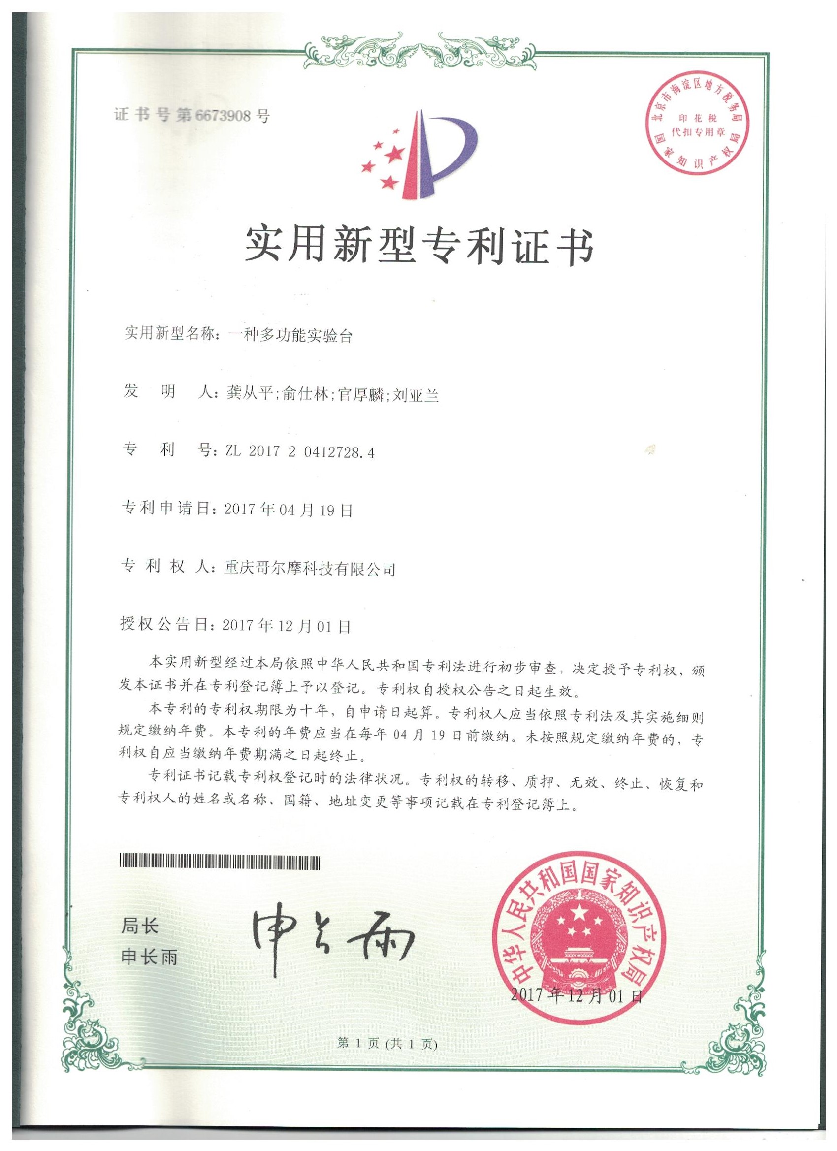 熱烈祝賀我公司榮獲“一種多功能實(shí)驗(yàn)臺(tái)”實(shí)用新型專利證書